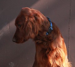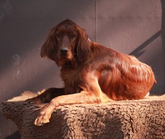 Irish Setter Hündin Elaine hätte das Zeug zum Deutschen Champion VDH gehabt, einem Schönheitstitel. Aber manchmal passen die menschlichen Zeitpläne nicht mit den Rundreisen zum Sammeln der Irish Setter Titel- Anwartschaften zusammen. Sie ist eine ruhige und sehr freundliche Irish Setter Hündin.